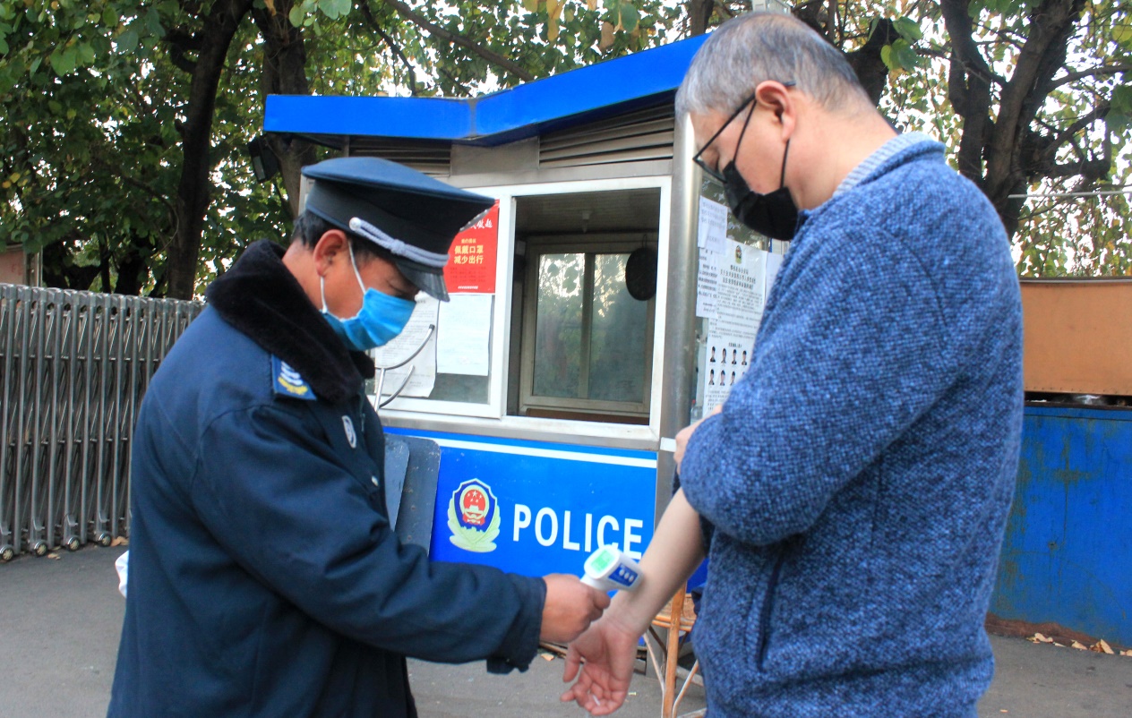 在學院大門口,經過培訓后的防疫人員在學院保衛科的配合下,對進出校區的人員及車輛進行逐一登記,并檢測體溫,檢查人員根據檢查結果確定進出人員身體體溫正常、身體健康,然后給予放行。每到上班高峰期,人員進出相對集中,但大家并無怨言,自覺排隊,同檢查人員高度配合,有序檢測,有序登記。