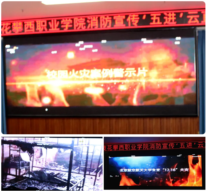 首先通過播放 “清華大學‘12.18’爆炸起火事故”“北京航空航天大學食堂‘12.16’火災”“北京交通大學實驗室‘12.26’爆炸起火事故”“廣西大學‘8.14’學生宿舍火災”等典型校園火災案例警示片,讓師生們認識到火災的殘酷無情和巨大的危害性,引起大家對消防安全的高度重視。