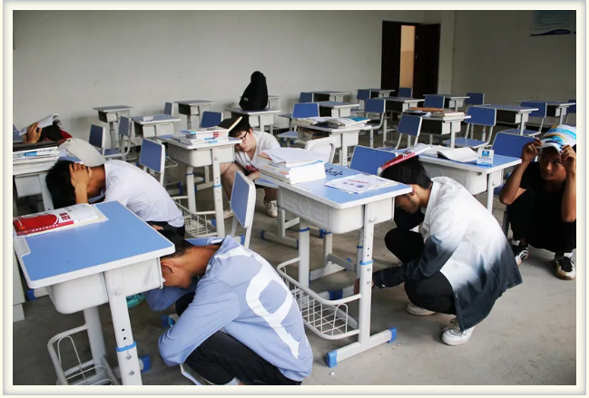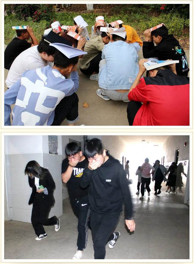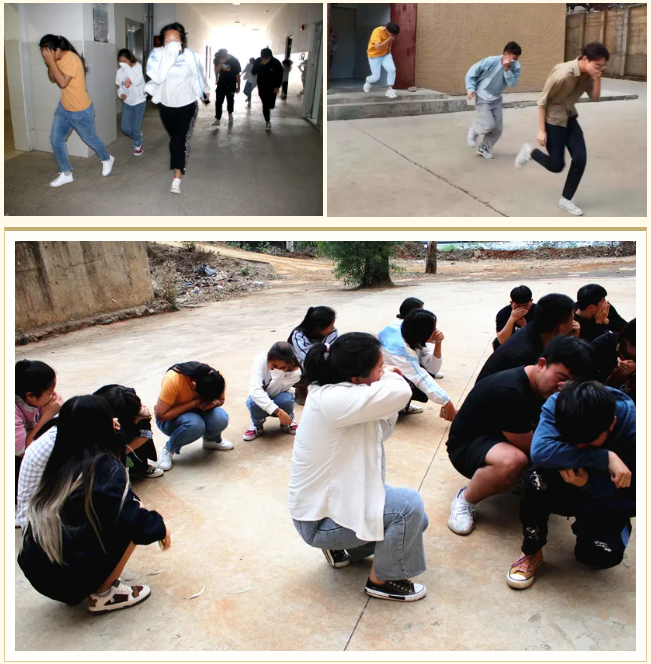 17:30分,消防、防震演練正式開始。當火災警報聲響起時,學生們在上課老師的組織下,用衣服、毛巾等捂住口鼻,彎腰、弓背,沿預定消防路線迅速、有序撤離教室,到達教學樓前的空地集合并清點人數。在地震演練中,當聽到地震警報聲,同學們迅速躲在課桌下,隨后在任課教師的指揮下,用書包、書等遮擋住頭部,沿預定撤離路線快速撤離到教學樓前的空地集合并清點人員,完成防震演練。
