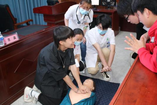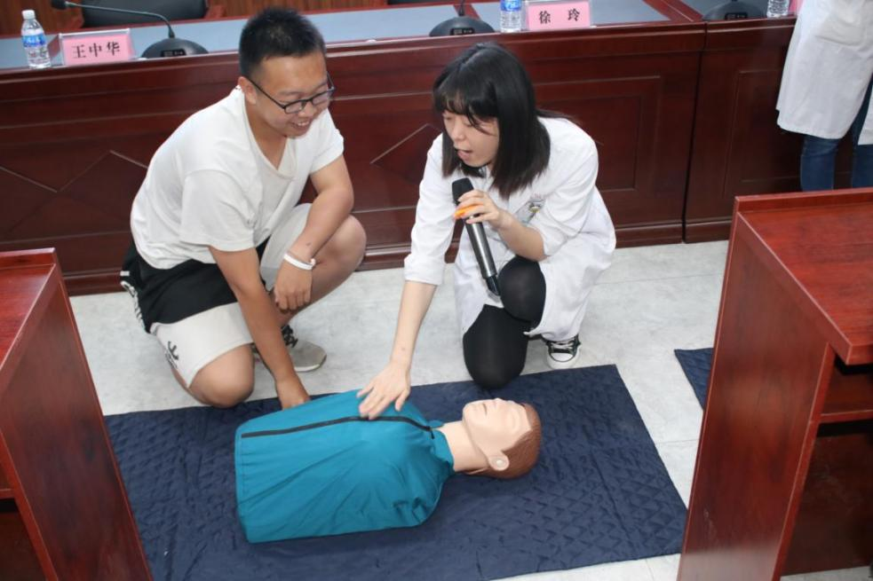 還為學(xué)生和老師進行了手把手教學(xué),讓大家實際操作更深入的了解了心肺復(fù)蘇和人工呼吸。