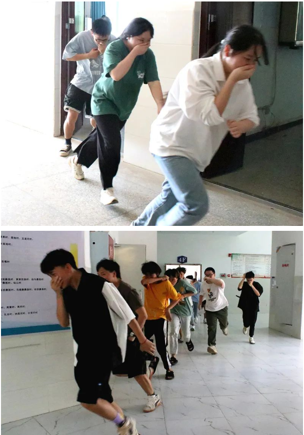 在消防逃生演練中,當警報聲響起,正在教室上課的同學們迅速手捂住口鼻,在老師的組織下,彎腰、有序、安全地按預定撤離路線迅速撤離到操場,并及時清點人數并上報老師。