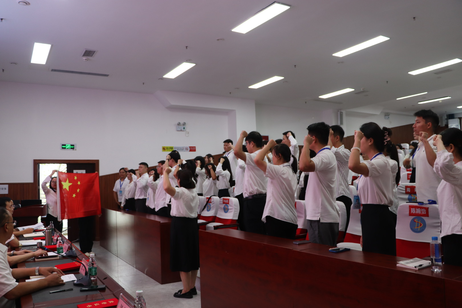 慶祝大會上,所有新入職教師在組織人事處處長馬小林的帶領下面對鮮艷的五星紅旗莊嚴宣誓。