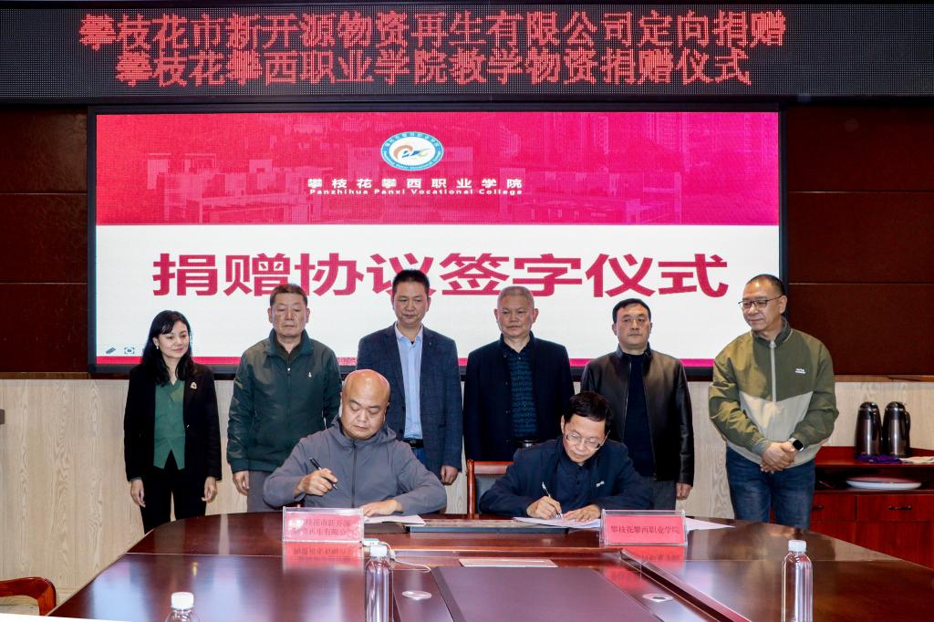 11月29日下午,攀枝花市委統(tǒng)戰(zhàn)部副部長楊毅軍,攀枝花市汽車流通商會副會長、市新開源物資再生有限公司(以下簡稱新開源公司)董事長兼總經(jīng)理崔大為,市職業(yè)職教社服務中心相關負責人一行蒞臨我校出席新開源公司定向捐贈攀枝花攀西職業(yè)學院教學物資捐贈儀式。我校全體校領導班子出席,相關處室系部負責人參加。