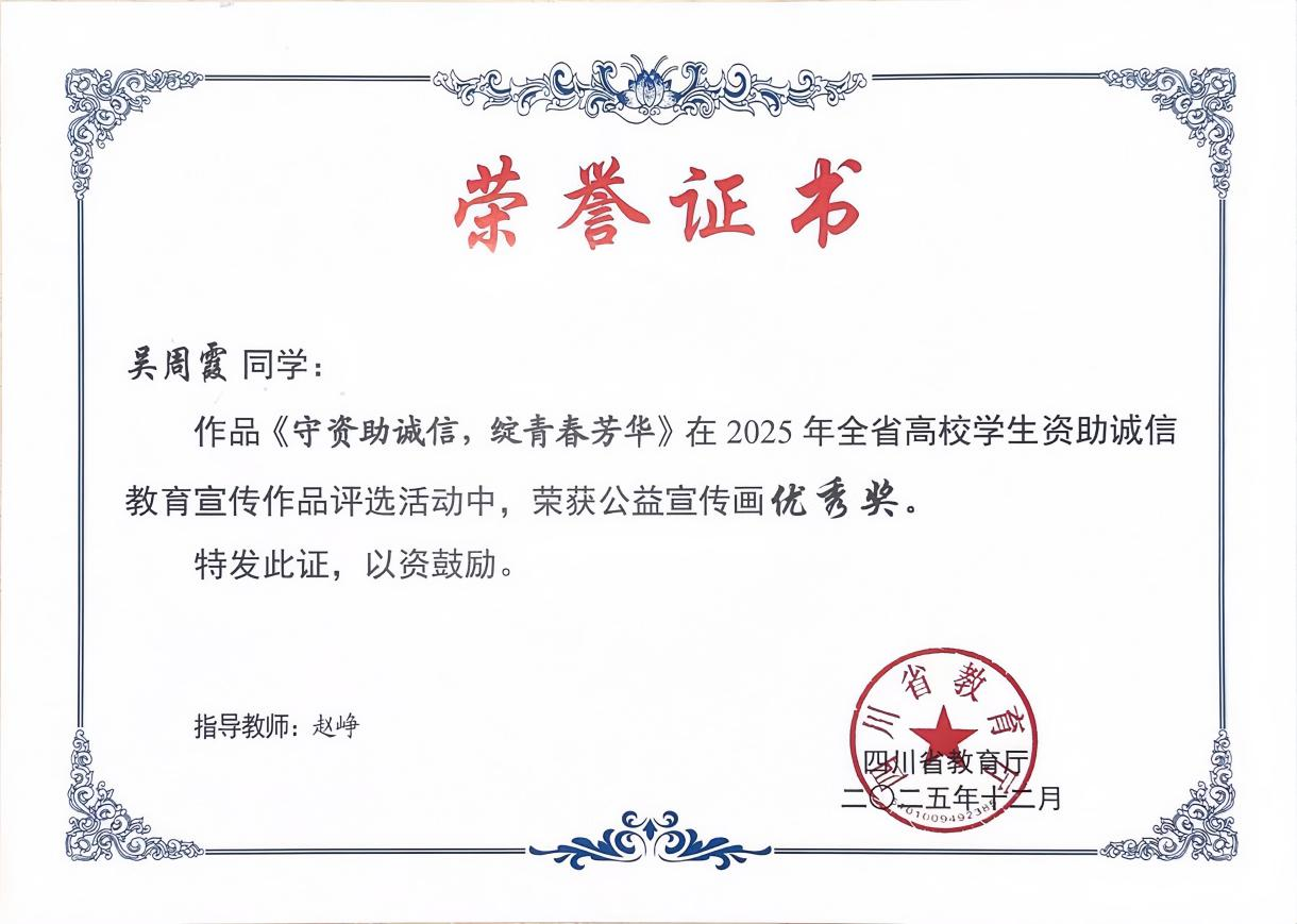 12月5日,由四川省教育廳、中國人民銀行四川省分行聯合主辦的2025年全省高校學生資助誠信教育宣傳作品征集評選結果揭曉。我校博訊產業學院學生吳周霞憑借主題鮮明、情感真摯的原創作品,從全省613件參賽作品中脫穎而出,榮獲優秀獎,為學校贏得榮譽。