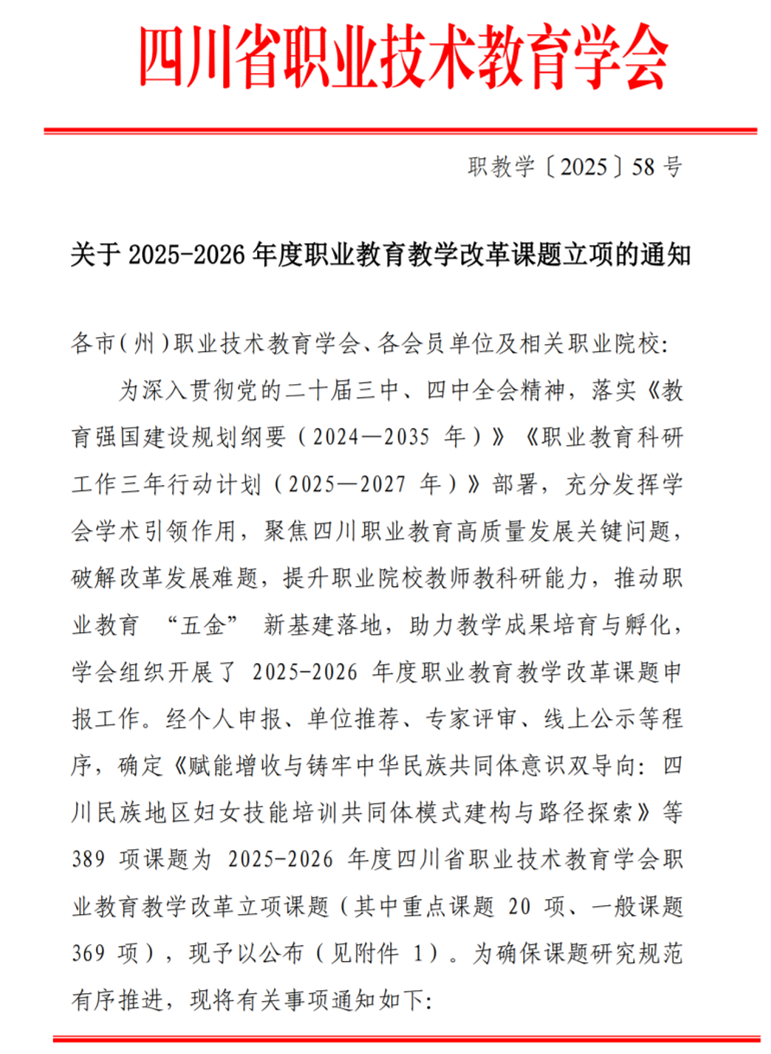 12月9日,四川省職業(yè)技術(shù)教育學(xué)會公布了2025—2026年度職業(yè)教育教學(xué)改革課題立項(xiàng)名單,我校原馬克思主義學(xué)院院長、基礎(chǔ)教育與公共管理系主任伍亞林主持申報(bào)的《高職院校“教”與“學(xué)”的全新模式研究》;智慧康養(yǎng)與現(xiàn)代農(nóng)業(yè)學(xué)院教師黃曉紅主持申報(bào)的《基于“食品安全衛(wèi)士”角色塑造的學(xué)生職業(yè)素養(yǎng)培養(yǎng)模式研究與實(shí)踐——以服務(wù)攀西地區(qū)農(nóng)業(yè)產(chǎn)業(yè)鏈升級為例》等課題成功進(jìn)入立項(xiàng)名單。此次兩項(xiàng)課題的獲批,是我校在職業(yè)教育教學(xué)改革領(lǐng)域持續(xù)深耕、銳意創(chuàng)新的重要體現(xiàn),不僅彰顯了我校教師扎實(shí)的科研能力與敏銳的教育洞察力,更對學(xué)校整體科研水平提升和教育教學(xué)質(zhì)量優(yōu)化具有深遠(yuǎn)意義。