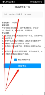 ⑦閱讀答題時長、題量說明、考試說明,核對姓名和準考證號并勾選【我已閱讀并同意】按鈕---點擊【繼續考試】---點擊【進入考試】;