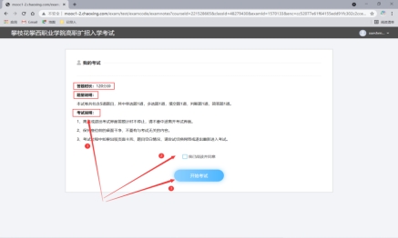 ⑤閱讀答題時長、題量說明、考試說明等考試信息,勾選【我已閱讀并同意】按鈕,點擊【開始考試】;