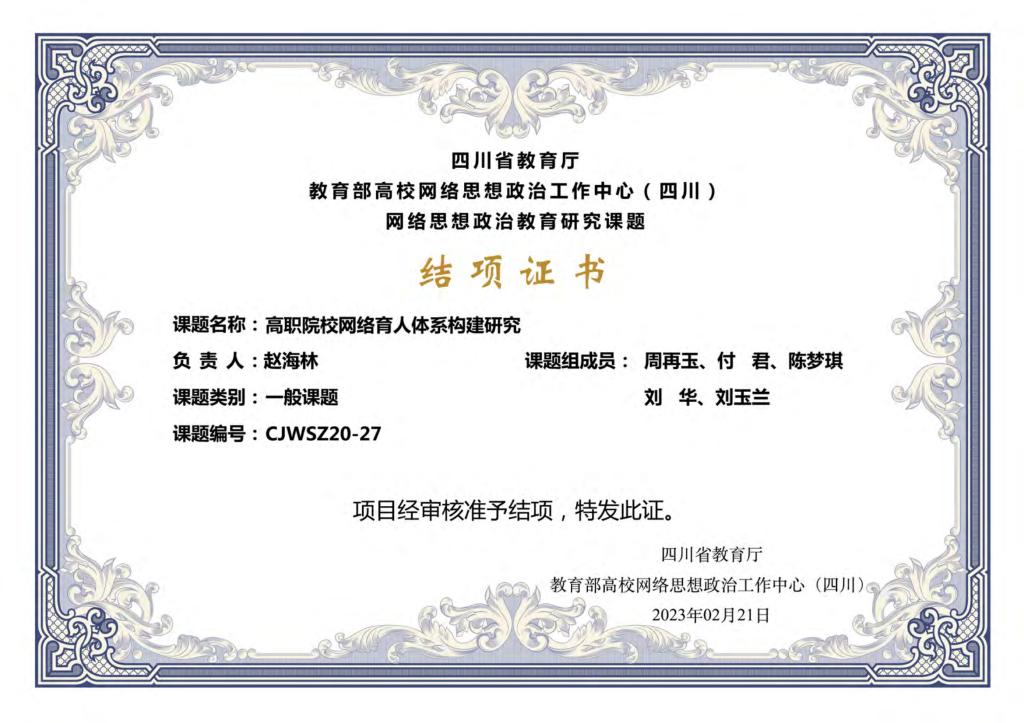 近日,四川省教育廳 教育部高校網(wǎng)絡(luò)思想政治工作中心(四川)公布“2020年網(wǎng)絡(luò)思想政治教育研究課題結(jié)題項(xiàng)目評(píng)審結(jié)果”,其中,由我校趙海林主持,周再玉、付君、陳夢(mèng)琪、劉華、劉玉蘭等5位老師參與的省級(jí)課題《高職院校網(wǎng)絡(luò)育人體系構(gòu)建研究》順利結(jié)題。