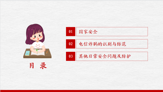 本次主題班會主要內容以國家安全、防范電信詐騙、樹立正確的消費觀,不進行網絡貸款、防火、防溺水、防電、乘車安全、假期安全、毒品安全等多個方面詳細的進行講解,讓學生在今后的學習和生活中將自身安全謹記于心。本次主題班會不僅向學生講解了如何保護自身,還通過國家安全這一節對學生進行愛國教育,引導學生樹立正確理想、信念、人生觀、價值觀。