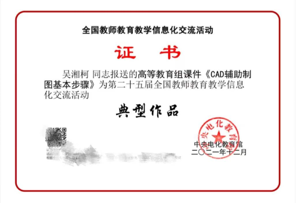2021年12月31日,由教育部指導、中央電化教育館主辦的“第二十五屆全國教師教育教學信息化交流活動”(原全國多媒體教育軟件大獎賽)落下帷幕,藝術設計系教師吳湘柯制作的《CAD輔助制圖基本步驟》多媒體課件榮獲高等教育組課件全國典型作品,這是我校教師首次入圍該項比賽并獲獎。