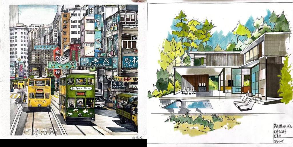 在建筑效果圖板塊,巨幅畫作展現了城市地標建筑的宏偉氣勢,精準的透視、細膩的光影處理讓觀者仿佛身臨其境,感受到建筑拔地而起的震撼力。