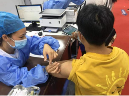 在疫苗接種室,學(xué)生擼起袖子,醫(yī)務(wù)人員一絲不茍,護(hù)士嚴(yán)格認(rèn)真按規(guī)程注射疫苗。