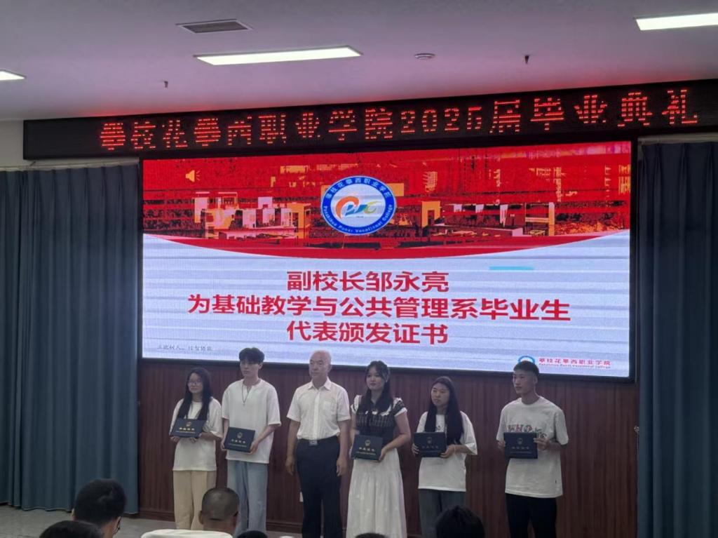 畢業典禮現場,副校長鄒永亮為基礎教學與公共管理系畢業生代表頒發證書,這一莊重時刻,是學校對學子學業成果的肯定,更是期許他們以所學奔赴廣闊未來。