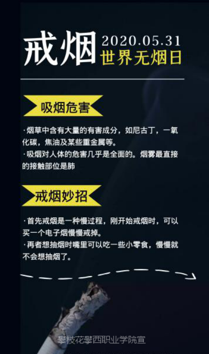 攀枝花攀西職業(yè)學(xué)院根據(jù)米愛辦[2020]13號文件精神,大力開展“世界無煙日”宣傳活動。