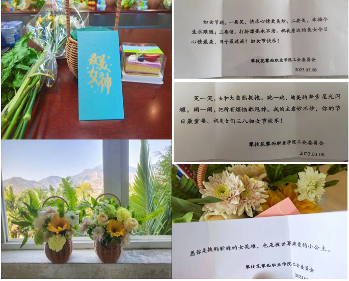 學院工會向所有在崗辛勤勞動的女職工們發放節日紅包,紅包內還有不一樣的節日祝福語。含苞待放的玫瑰,清新淡雅的康乃馨,金色活潑的向日葵,……一束束色彩斑斕的鮮花整齊有序的擺放在桌面上,拉開了女神節活動的帷幕。