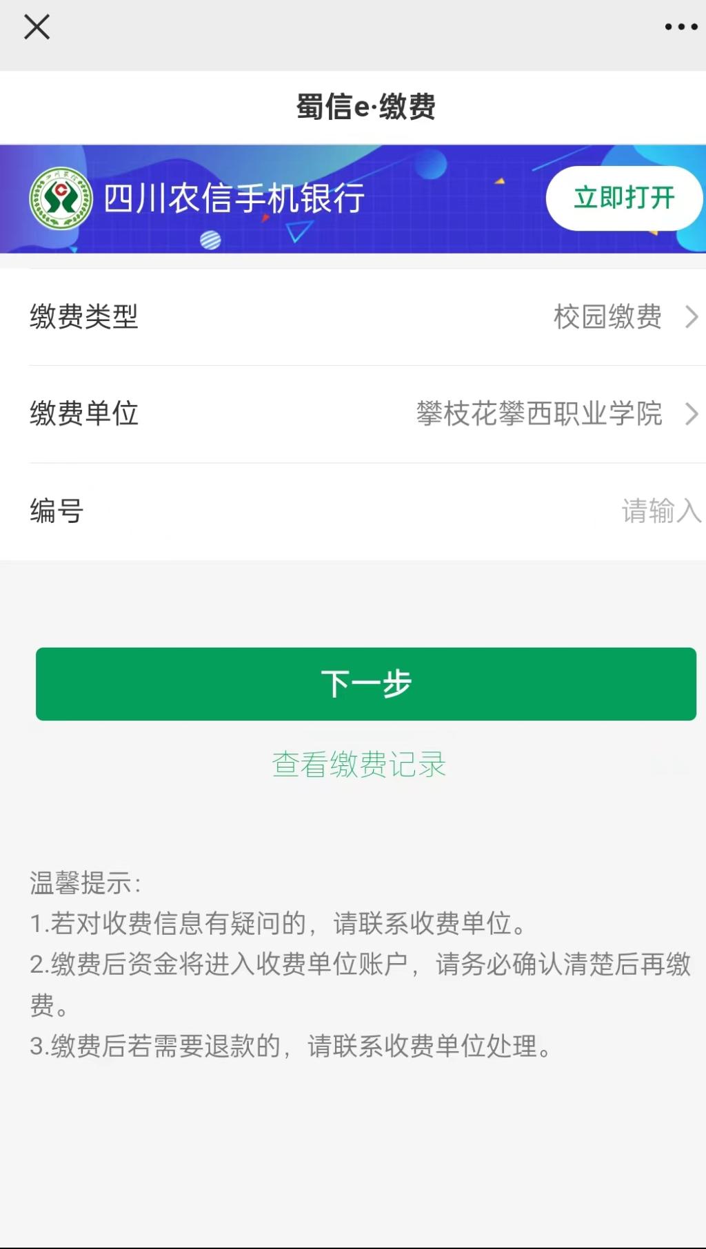 1.用微信、手機農(nóng)商行APP掃描學(xué)院農(nóng)信二維碼,進入網(wǎng)上蜀信e繳費系統(tǒng)。