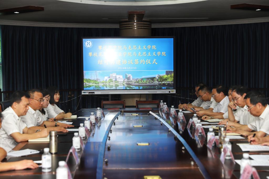 為深入學(xué)習(xí)貫徹習(xí)近平新時(shí)代中國(guó)特色社會(huì)主義思想和黨的二十大精神,認(rèn)真學(xué)習(xí)貫徹習(xí)近平總書(shū)記對(duì)學(xué)校思政課建設(shè)的重要指示精神,全面貫徹黨的教育方針,落實(shí)中共四川省教育工委、四川省教育廳《關(guān)于開(kāi)展四川省高校馬克思主義學(xué)院結(jié)對(duì)共建行動(dòng)的通知》的要求,5月31日,我校馬克思主義學(xué)院與攀枝花學(xué)院馬克思主義學(xué)院在攀枝花學(xué)院舉行了結(jié)對(duì)共建協(xié)議簽約儀式。攀枝花學(xué)院黨委常委、副校長(zhǎng)張旭輝,攀枝花攀西職業(yè)學(xué)院院長(zhǎng)潘吉平、黨支部副書(shū)記趙海林等出席,雙方有關(guān)部門(mén)領(lǐng)導(dǎo)及教師共同參加,見(jiàn)證簽約儀式。