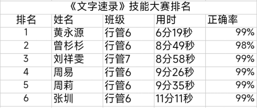 經過激烈的角逐,最終評選出了前六名優秀選手。行政管理6班的黃永源同學,以6分19秒的成績獲得此次比賽第一名。通過比賽,激發了同學們學技術、練技能的熱情,展示了同學們積極向上的精神風貌。