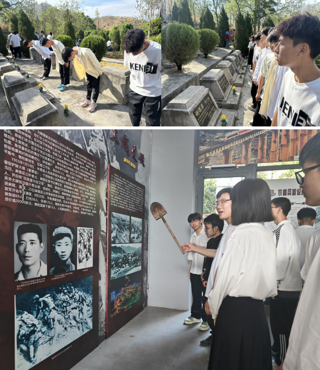 在張妮老師引領下,師生們肅立在烈士紀念碑前,深深鞠躬并向烈士紀念碑獻花,表達對英雄們的崇高敬意和無盡的哀思。接著,師生們跟隨解說員走進墓地,這些烈士墓仿佛也在靜靜地講述著先烈們的故事,激勵著同學們銘記歷史,珍惜和平,為中華民族的偉大復興貢獻自己的力量。最后,師生們來到紀念館,參觀了展出的歷史文獻和珍貴圖片。這些文獻和圖片生動地展示了革命歷史的艱辛與偉大,讓師生們更加直觀地感受到先烈們為國家和民族付出的巨大犧牲。
