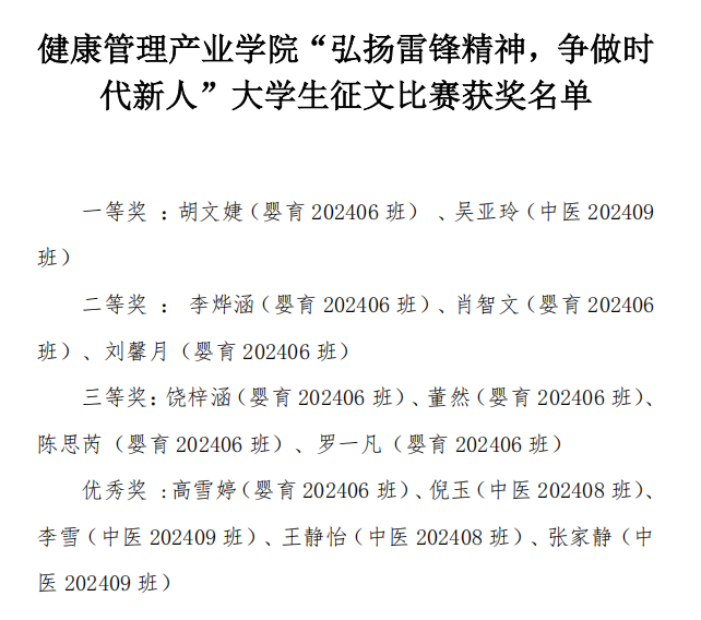 本次征文活動自開展以來,受到全院師生廣泛關注,共收到投稿作品25篇。參賽者結合健康管理專業特色,圍繞雷鋒精神與青年擔當、健康服務與社會責任等主題,用文字記錄身邊榜樣、講述志愿者故事、抒發家國情懷、展示當代大學生風采。經學院評審,最終評選出一等獎作品2篇、二等獎作品3篇、三等獎作品4篇及優秀獎作品5篇。獲獎名單如下: