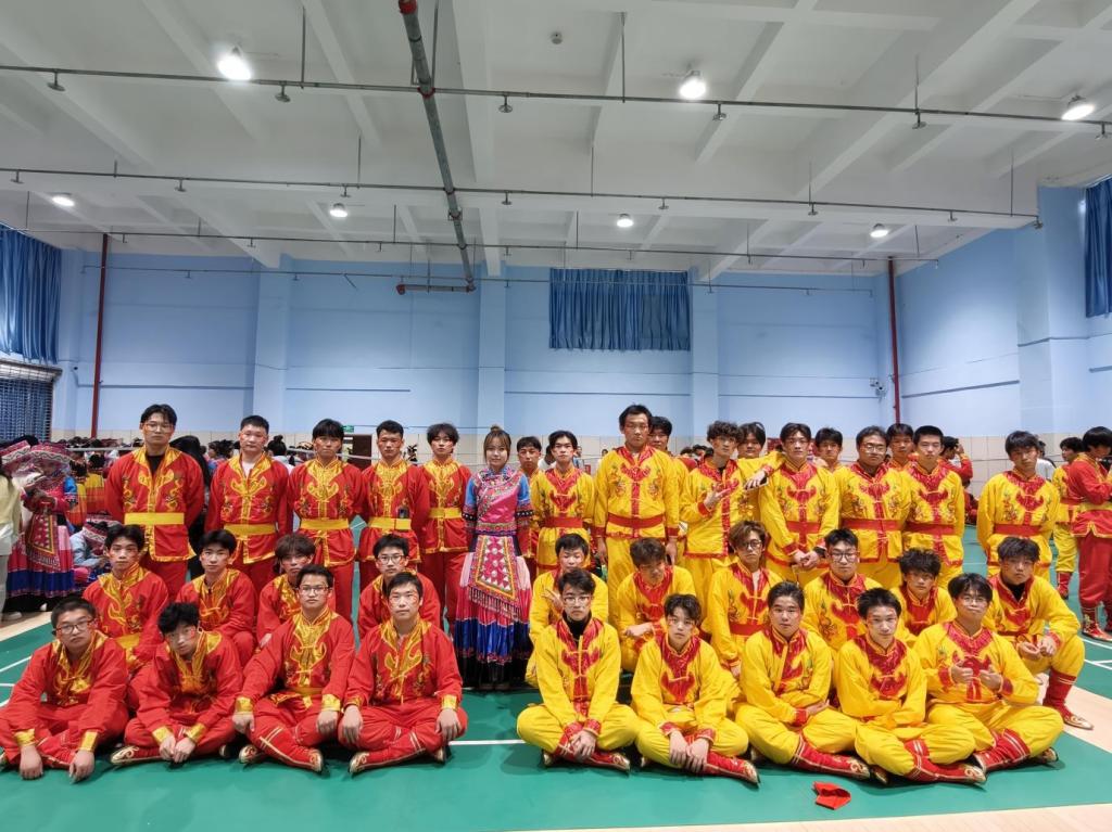 開幕式上,伴隨著激昂的鼓點,新能源與智能產業學院學生組成的龍獅隊率先登場。紅黃兩色龍身穿梭騰躍,時而“金龍盤柱”,時而“蛟龍探海”,動作剛勁有力又不失靈動;憨態可掬的雄獅踩著節拍“踩球吐福”“雄獅獻瑞”,每一個細節都展現出扎實的功底。隨后,米易非遺展演環節溫情上演,同學們身著傈僳族傳統服飾,隨著葫蘆笙的悠揚旋律跳起《斑鳩吃水》,服飾上的非遺刺繡紋樣在燈光下熠熠生輝,將米易傈僳族非遺文化的獨特魅力展現得淋漓盡致。創意編排中,同學們還巧妙融入隊形變換,以肢體語言勾勒出文化傳承與青春活力的交融圖景,為賽場注入了濃厚的本土文化氣息。