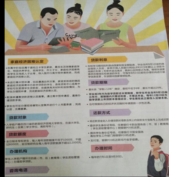 為了“不讓一個學生因家庭經濟困難而失學”近日,縣教育局下發了四川省國家開發銀行生源地信用助學貸款宣傳單,我校立刻對參加2020年升學考試的所有學生進行大學生生源地信用助學貸款優惠政策宣傳。并下發助學貸款申請指南等形式,指導學生做好資格認定工作。通過介紹生源地助學貸款政策、還款流程、學制及賬戶變更等相關要求,提高助學貸款工作的準確性和辦理效率,避免學生及家長多次往返奔波