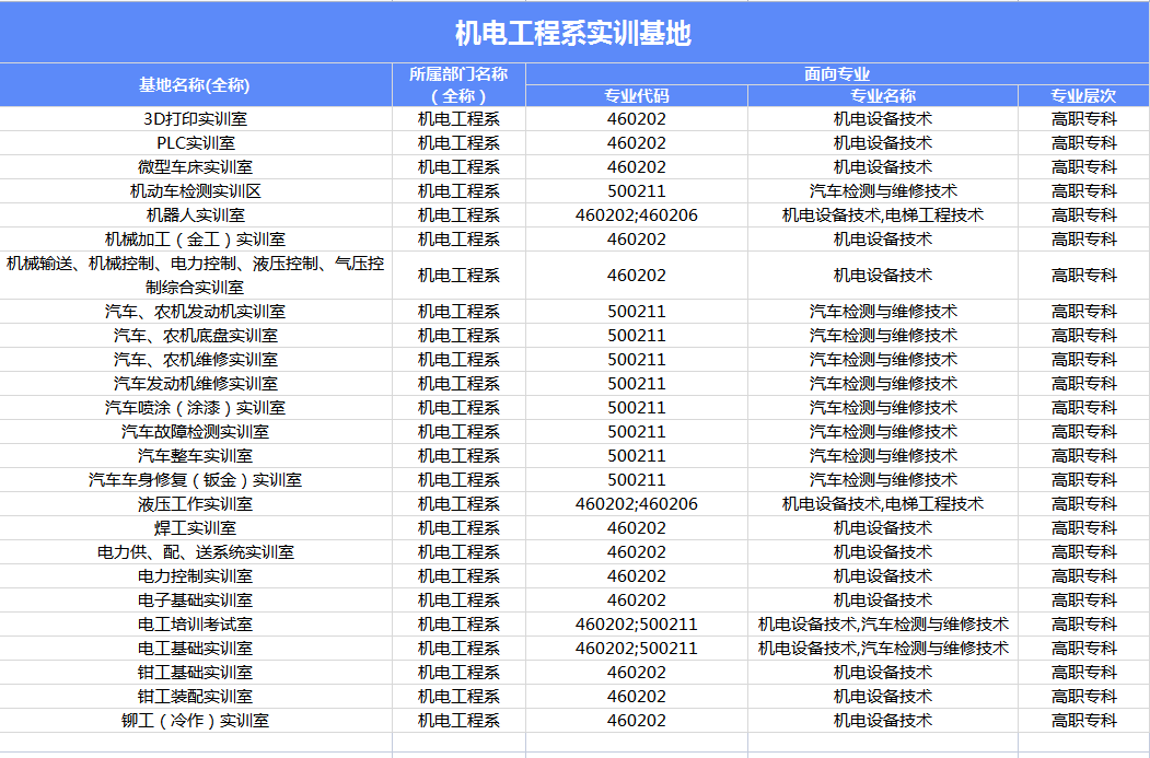我系現建有機加工、焊工、液壓與氣動、PLC、CAD/電腦輔助設計、3D打印、汽車發動機、汽車鈑金噴涂等實訓室,分別與東方鈦業公司、米易鑫亞汽修廠、四川江海源機電設備公司、攀枝花水鋼紅發礦業有限公司、米易瑞琪陶瓷材料加工有限責任公簽訂校外實訓基地合同。